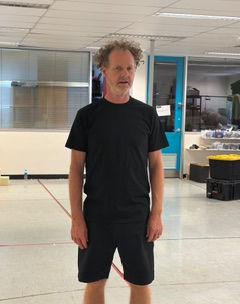 black t-shirt , black shorts, black shoes and black socks. This is set against a design of red and white corflute.